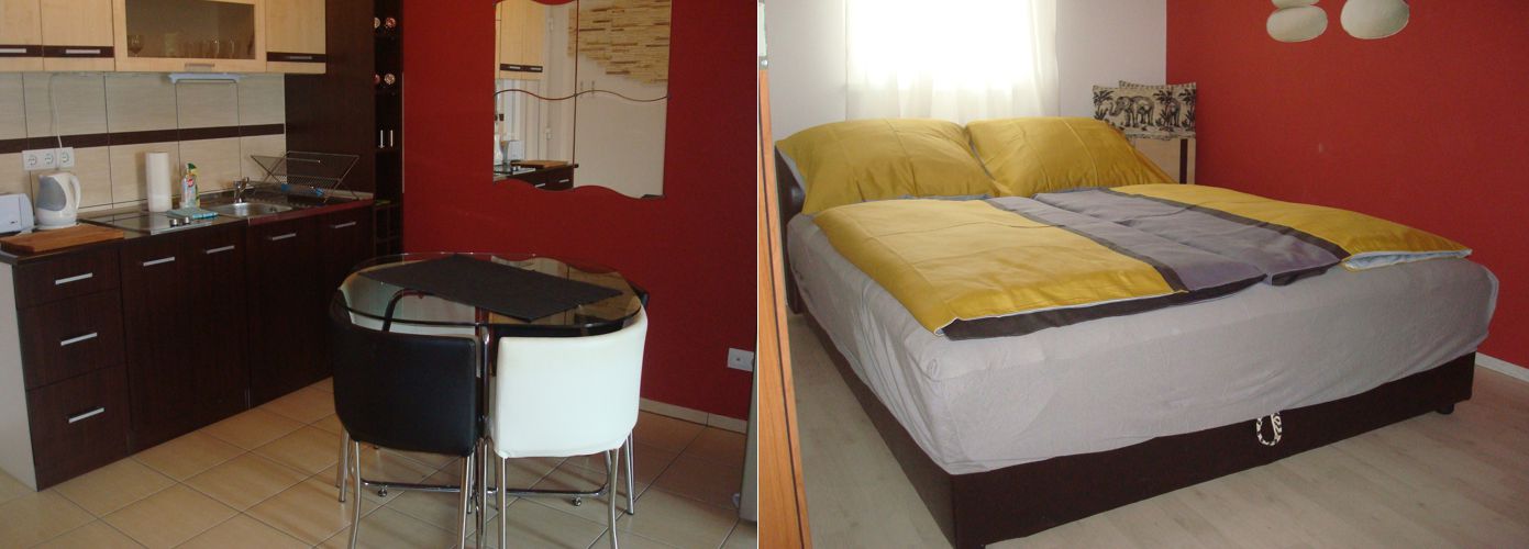 Apartman: 85 m2 6-8 fő részére (4 + 3 + 2 fő részére) 2,5 szoba, konyha, fürdőszoba és külön wc.